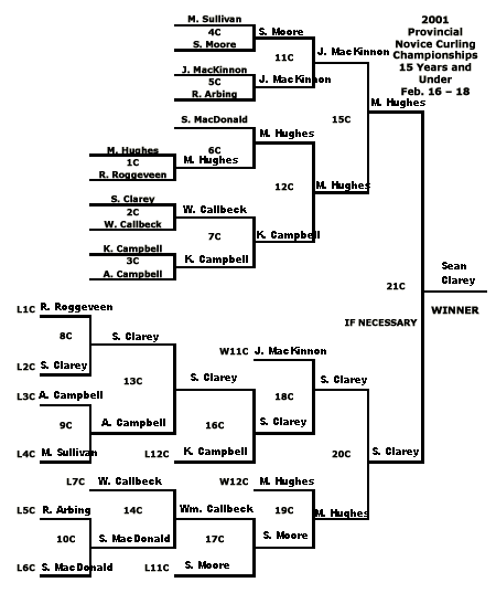 In the Rundell Seaman Memorial 15 and under section, it's Meaghan Hughes of the Charlottetown Curling Club meeting Montague's Sean Clarey rink in the final. This morning, Clarey defeated Jennifer MacKinnon of Charlottetown 10-1, and Hughes downed Charlottetown's Sarah Moore rink 8-3. Clarey then defeated Hughes 6-2 Sunday afternoon to force the final at 3 PM.