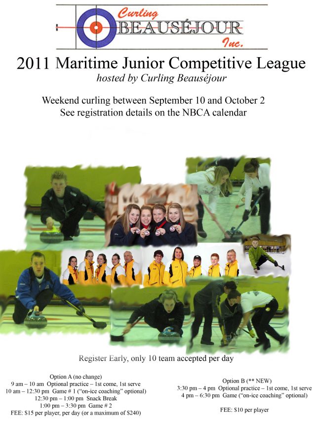 The 2011 Maritime Junior Competitive League is hosted by Curling Beauséjour in Moncton, and takes place on weekends between September 10 and October 2. Register early – only 10 teams are accepted per event day.