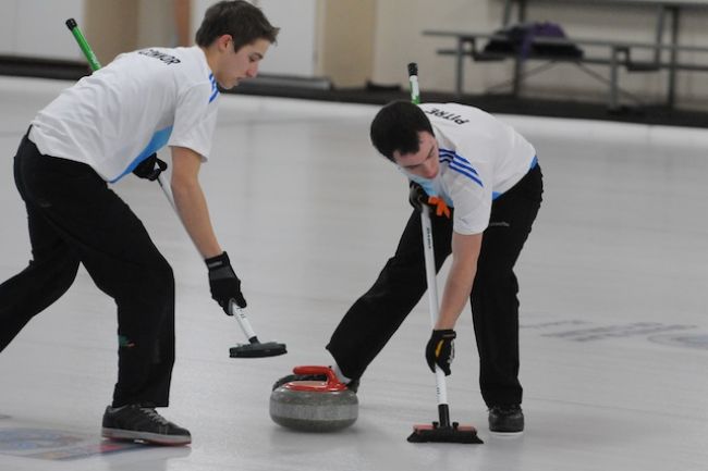 Photo – Jason Simmonds/Journal Pioneer: Lead Noah O’Connor, left, and second stone Shawn Pitre sweep a rock for the Matthew MacLean rink during Thursday’s opening draw of the Pepsi P.E.I. provincial junior curling championships at the Silver Fox Curling and Yacht Club in Summerside.