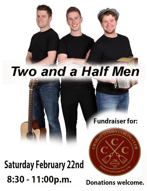 The Charlottetown Curling Complex are holding a fundraiser tonight at the Complex. Donations are welcome. Two and a Half Men, featuring well-known curler and entertainer Robbie Doherty are the band. Showtime is 8:30 to 11 pm. Drinks specials.