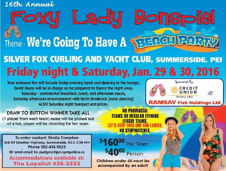 The Foxy Lady hits the beach Friday night January 29, and all day Saturday Jan. 30, 2016, at the Silver Fox Curling and Yacht Club in Summerside’s the 16th Annual Foxy Lady women’s bonspiel, with this year’s theme “We’re Going to have a Beach Party”. The event, sponsored by Malpeque Bay Credit Union and Ramsay Fish Holdings Ltd., will include Friday evening lunch, and dancing in the lounge, with David Doyle in charge. Saturday will include continental breakfast, lunch, mid-afternoon snack, and more dancing, with Sat. evening entertainment by Keith Brodeick, plus a Saturday night banquet and prizes. The event also includes a Winner Take All draw to the button contest, where one player from each team will have her name drawn from a hat, and will shoot for the team.
