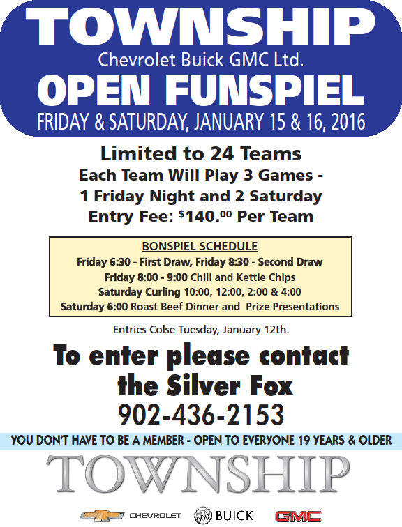 The Township Chevrolet/Buick/GMC Open Funspiel goes January 15 and 16 at the Silver Fox Curling and Yacht Club in Summerside. Entry is limited to 24 teams, and guarantees three games – 1 Friday evening, and 2 on Saturday. Entry fee is $140 per team, and it’s open to everyone 19 and over. Please sign up by Tuesday, Jan. 12.