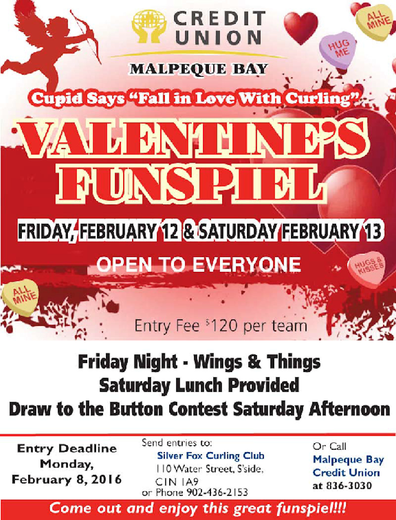 The Silver Fox Curling and Yacht Club is hosting a Valentine’s Funspiel, sponsored by Malpeque Bay Credit Union, on Friday Feb. 12 and Saturday the 13th. It’s open to everyone, and entry fee is $120/team. “Wings and things” Friday evening, and Saturday lunch are included. A Draw to the Button contest will be held on Saturday. Entry deadline is Monday Feb. 8. Send entries to the Silver Fox Curling Club, 110 Water St. Summerside PEI C1N 1A9, or phone 902-436-2153, or the Credit Union at (902) 836-3030. Come out and enjoy this great funspiel!