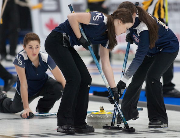 Nova Scotia second Karlee Burgess delivers rock to sweepers Janique LeBlanc, left, and Kristin Clarke. (Photo, Curling Canada/Bob Wilson)