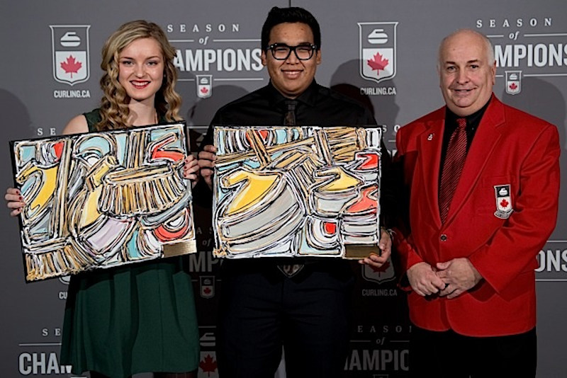 Ken Watson Sportsmanship Award winners (L-R): Chloé McCloskey (PEI), Arthur Siksik (Nunavut), Curling Canada Vice-Chair of the Board of Governors, Peter Inch