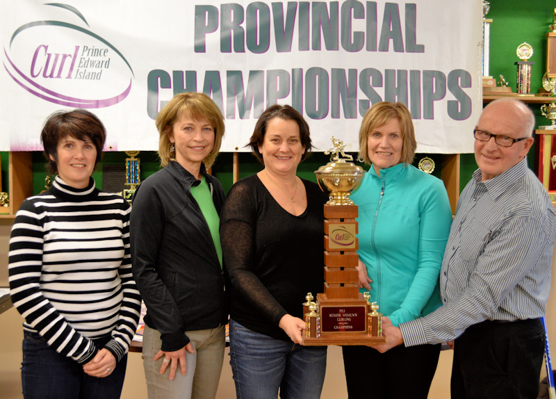 (L-R): PEI Credit Unions Senior Women’s champs Julie Scales, Sandy Matheson, Susan McInnis, Kim Dolan,, with Clair Sweet from the host Maple Leaf Curling Club.