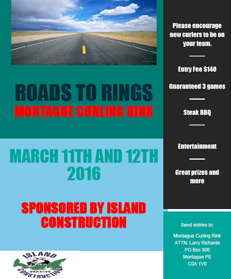 The Roads to Rings bonspiel, sponsored by Island Construction, will be held March 11 and 12 at the Montague Curling Rink. Please encourage new curlers to play on your team. Team entry is $140, and includes 3 games guaranteed, a steak barbecue, entertainment, great prizes and more. Send entries to Larry Richards at the Montague Curling Rink, PO Box 806, Montague PEI C0A 1V0