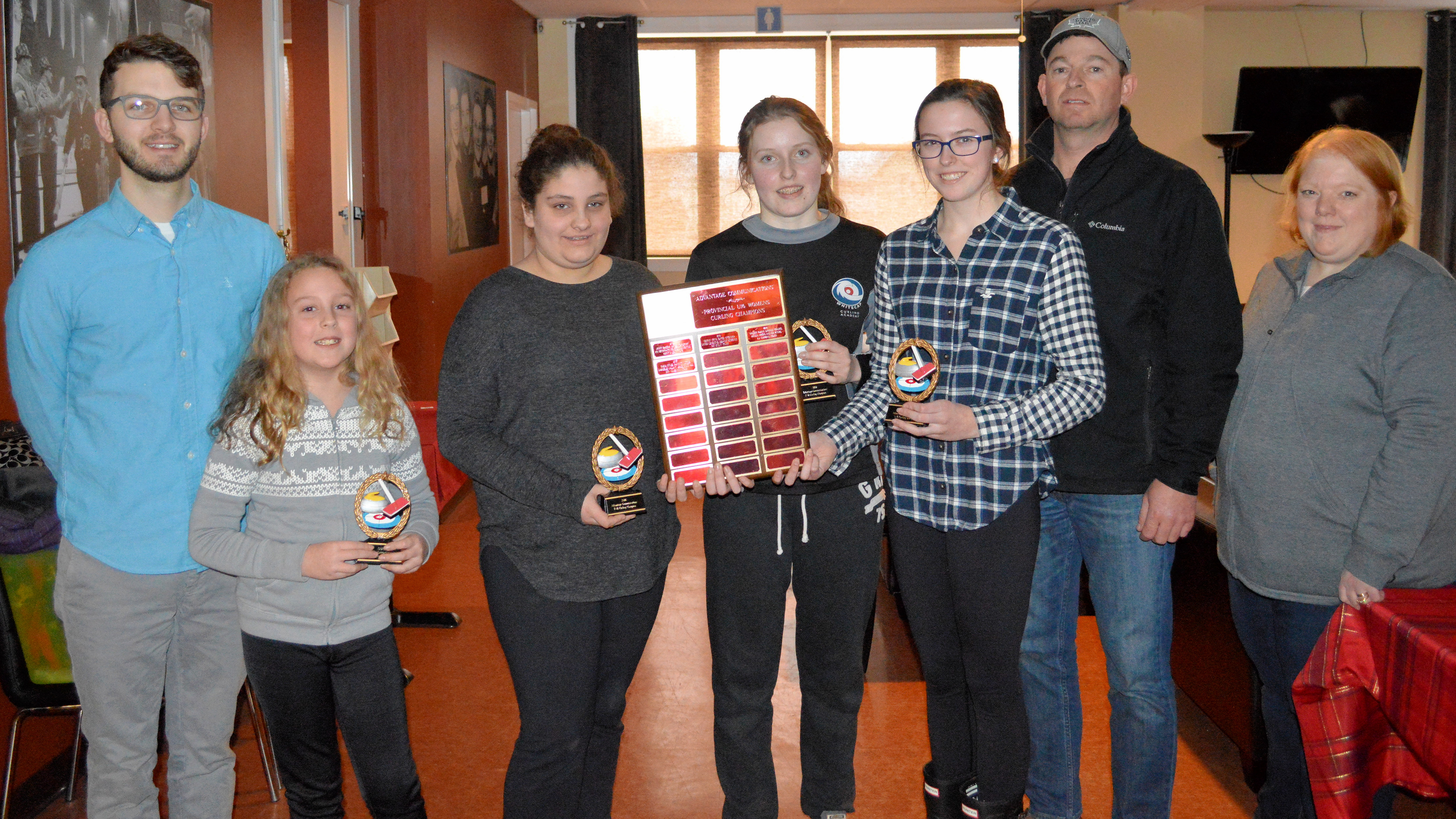 (L-R): Nick van Ouwerkerk from Advantage Communications, Megan MacDonald, Lauren Ferguson, Olivia Barbour, Tegan Corkum, coach Shelley MacFadyen, Curl PEI President Angela Hodgson