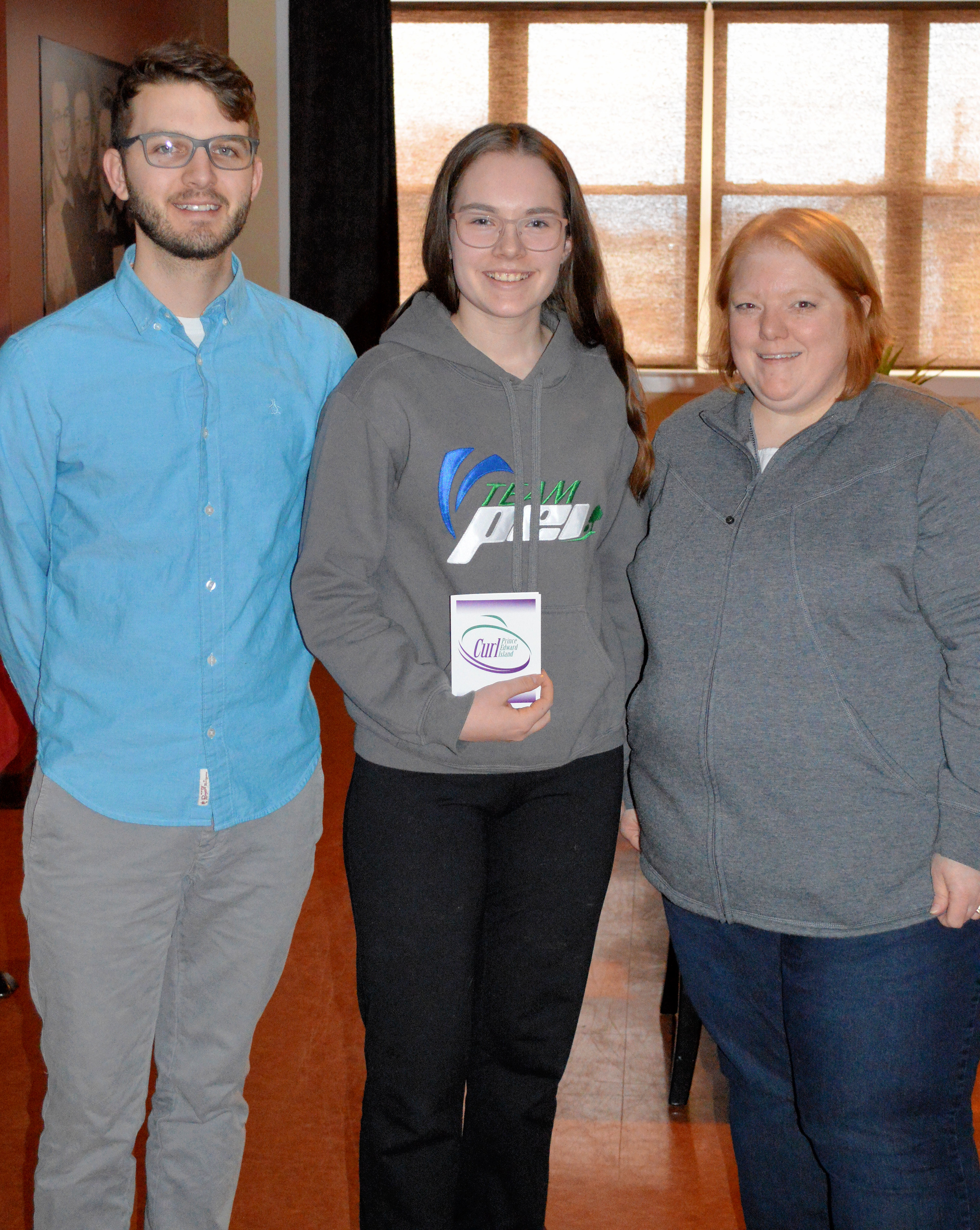 (L-R): Nick van Ouwerkerk from sponsor Advantage Communications, Baily O’Grady, Angela Hodgson, president of Curl PEI