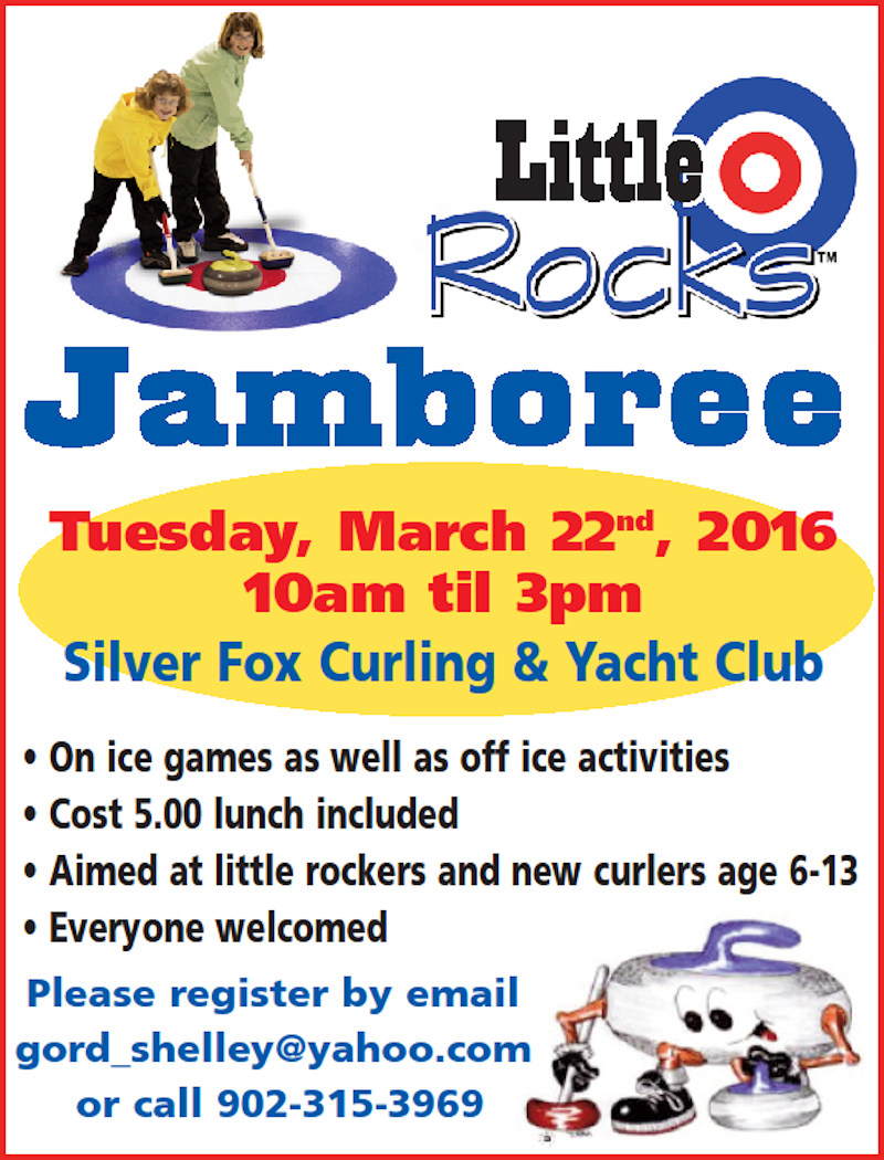 The Silver Fox Curling & Yacht Club in Summerside is hosting a Little Rocks Jamboree, aimed at Little Rockers and new curlers age 6-13. Everybody (all clubs) welcome. The Jamboree takes place Tuesday March 22 from 10 am to 3 pm, and the cost of only $5 per curler includes lunch. There will be both on-ice games and off-ice activities.