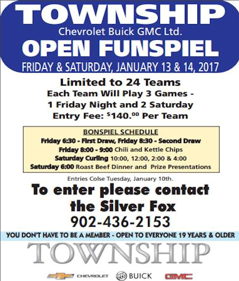 The Township Chevrolet, Buick, GMC Open Funspiel, open to everyone 19 years of age and older, takes place Friday and Saturday January 13 and 14 2017 at the Silver Fox Curling and Yacht Community Complex in Summerside. Entry is limited to 24 teams, and 3 games – one Friday night and two on Saturday, are guaranteed. Draws are Friday at 6:30 and 8:30 pm, and Saturday at 10, 12 noon, 2 and 4. A roast beef dinner, along with prize presentations, will take place on Saturday, beginning at 6 pm.