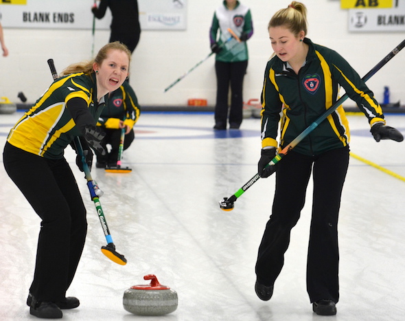 Northern Ontario’s Laura Masters, left, and Sara Guy are headed to the playoffs at the 2017 Canadian Juniors. (Photo, Curling Canada/Al Cameron)