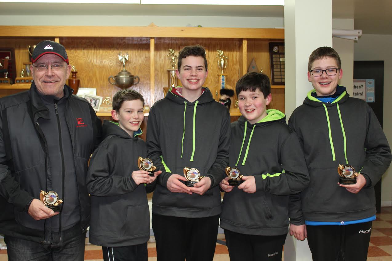 Cornwall’s Mitchell Schut rink won their final game in the three-team double round robin boy’s division, Sunday afternoon at the Western Community Curling Club in Alberton, beating the Cruz Pineau foursome from the Silver Fox Curling and Yacht Community Complex in Summerside by an 8-3 score, and clinching their second PEI Under 16 boy’s title. The evening match, between Pineau, and Cornwall’s Chase MacMillan rink, became a battle for second place, with MacMillan winning 6-4.
