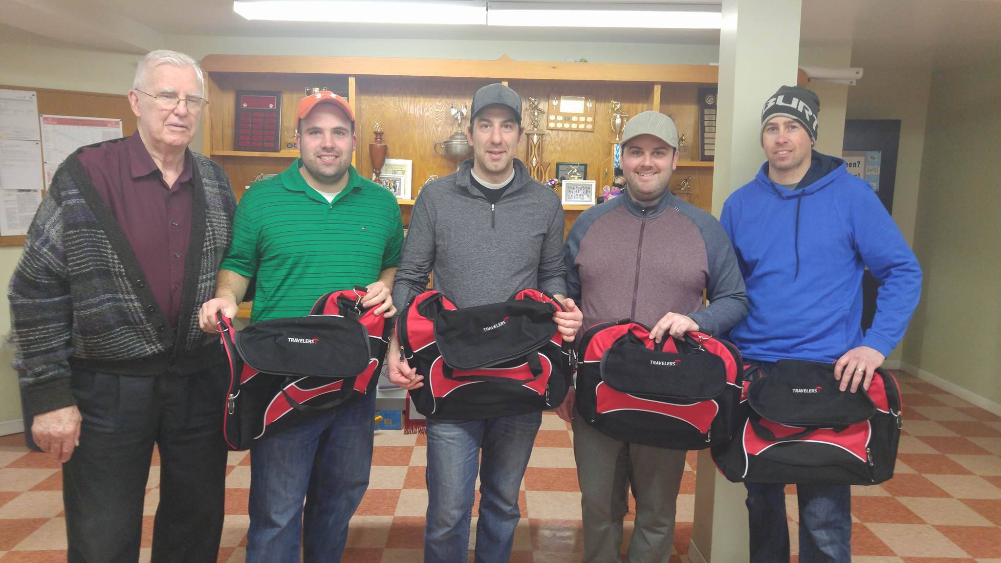 Winning Silver Fox rink (L-R): Fr. Art Pendergast from the host club, Leo Stewart, Barry Cameron, Darrell Thibeau, Cory Montgomery