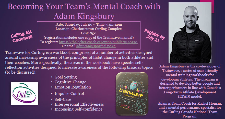 Curl PEI’s Performance Committee is excited to announce two upcoming workshops with Mental Performance Specialist – National Team Program (Curling Canada), Adam Kingsbury.