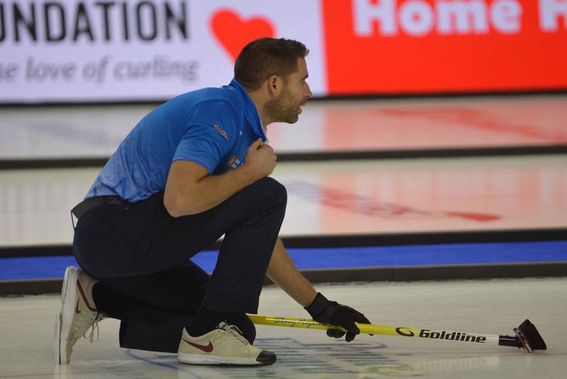 Skip John Morris in action during Sunday morning action at the 2017 Road to the Roar Pre-Trials curling event at Eastlink Arena in Summerside. – Jason Simmonds