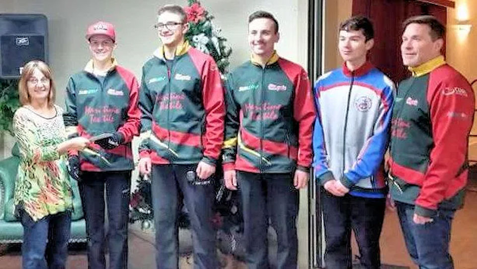 Photo: Organizer Sheila Compton (left) with winning Junior Men’s Team Donovan (L-R): Michael Donovan, Matthew Magee, Donovan Lanteigne, alternate Jacob Nowlan, Coach Daryell Nowlan. Missing: Josh Nowlan (he played in the round robin, while his younger brother Jacob replaced him in the playoffs). Photo credit: Denise Nowlan