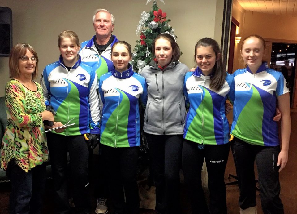 (L-R) Organizer Sheila Compton with winning junior women’s Team Kelly: skip Annika Kelly, third Cynthia Pearson, second Tat Kelly, and lead Meghan Ching. Photo credit: Doug Kelly