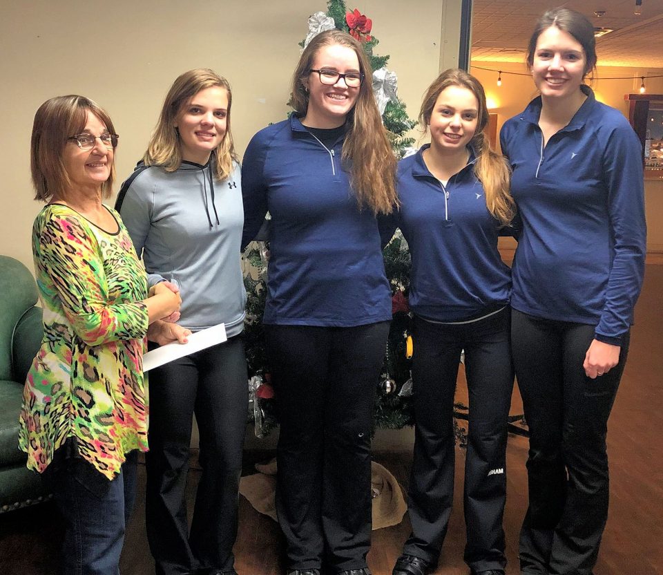 Organizer Sheila Compton (left) with runner-up women’s Team Burris (Front row left to right): Lauren Ferguson, Katie Shaw, alternate Amy Spence, Lexie Murray. Back row: Coach David Murphy.