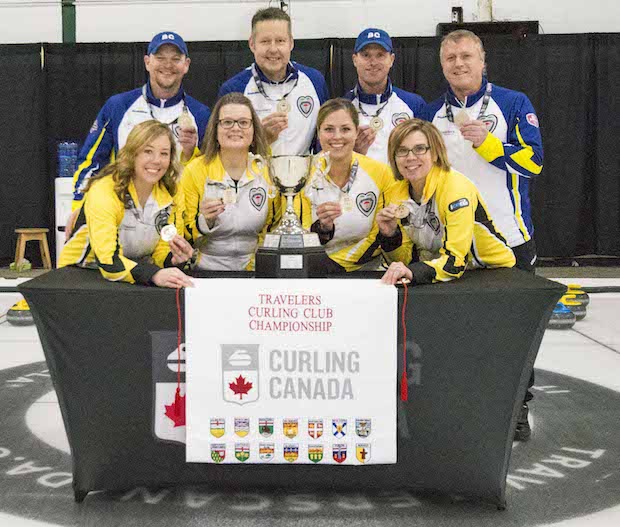 Team BC men (Skip Bart Sawyer, third Steve Waatainen, second Craig Burton and lead Keith Clarke) and Team MB women (Skip Stacey Fordyce, third Christy Erickson, second Stacey Irwin and lead Pam Gouldie): Gold medallists at the 2017 Travelers Curling Club Championships in Kingston, Ont. (Curling Canada/Donna McQuillan photo)