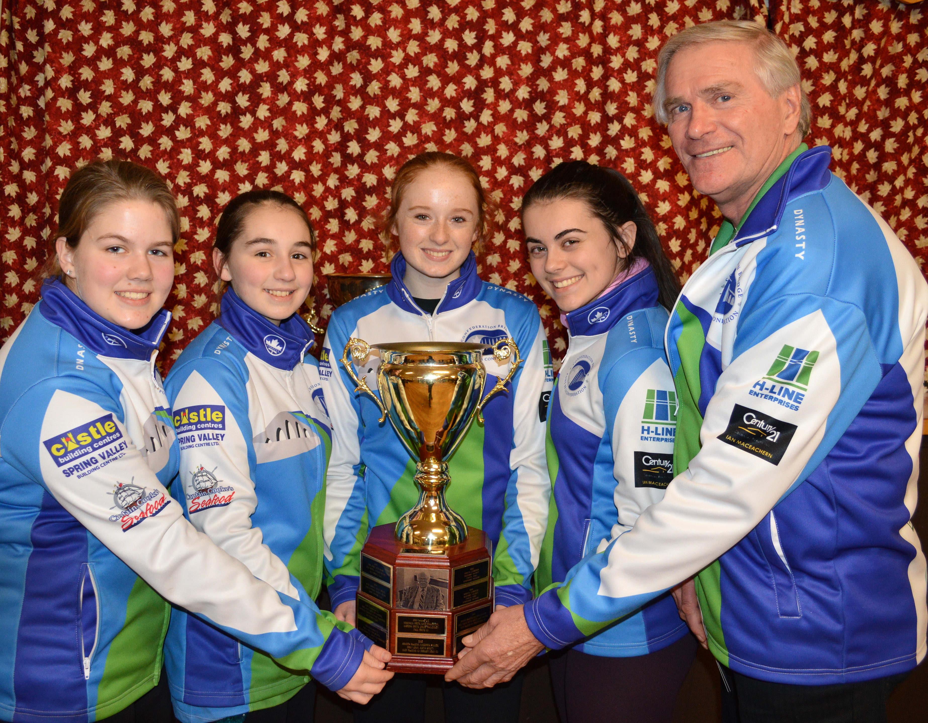 Following today’s final games at the Pepsi Provincial Junior Curling Championships at the Maple Leaf Curling Club, it was time to present the trophies to the winners and runners-up, as well as the certificates to the winners of the Asham Coaching Awards, as voted on by all the coaches, and the Sportsmanship awards, as voted on by the players.