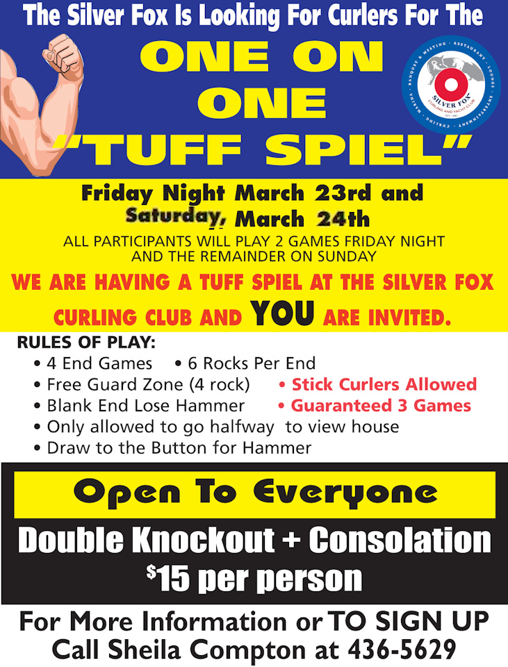 The annual One on One “Tuff Spiel” takes place Friday evening March 23 and continues on Saturday March 24th (revised date) at the Silver Fox Curling and Yacht Community Complex in Summerside. It’s open to everyone. You play two games Friday evening and the rest on Sunday.