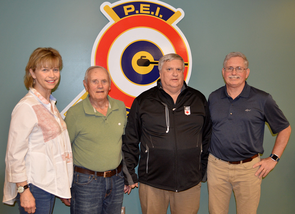 Photo (L-R) 2017-2018 Curl PEI Vice President Sandy Matheson, Jerry Muzika, President of the PEI Curling Hall of Fame and Museum, Curling Canada Volunteer of the Year finalist Derek MacEwen, and Gary O’Sullivan, president of the Cornwall Curling Club.