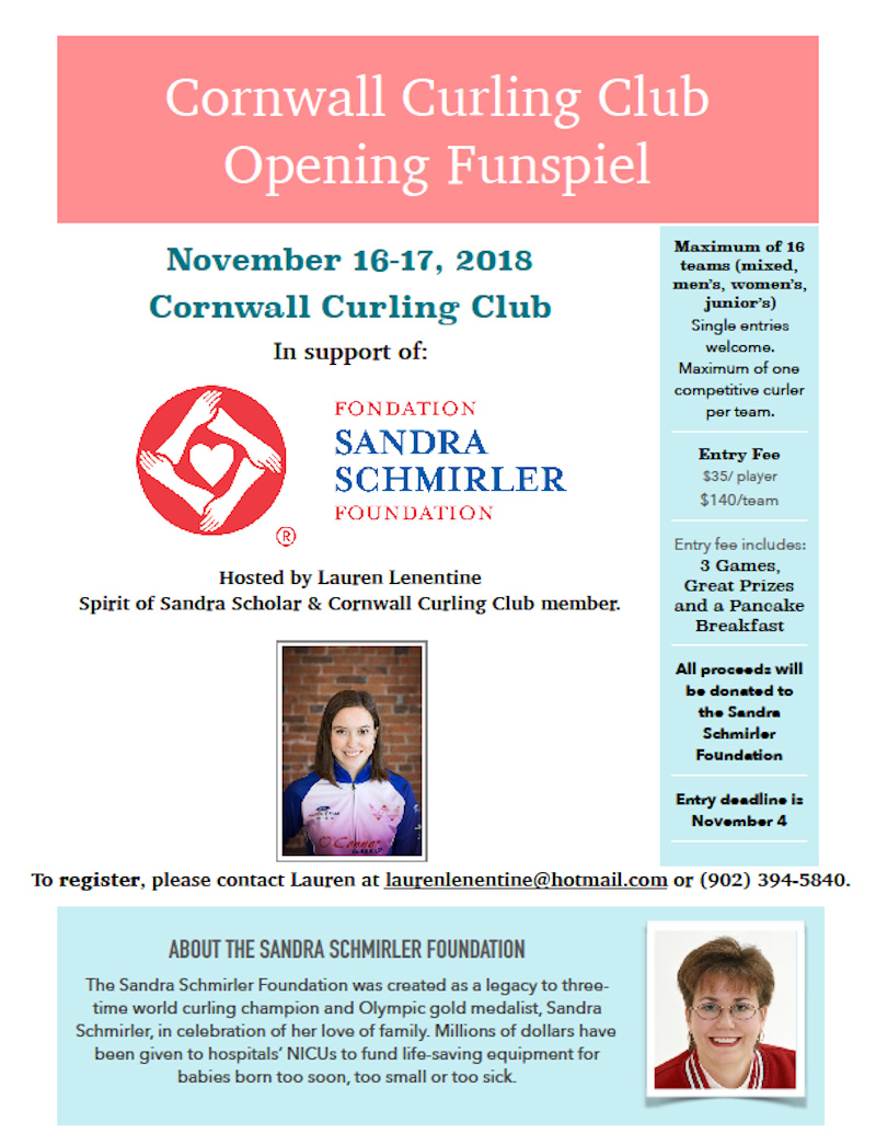 Lauren Lenentine, a member of the Kaitlyn Jones World Junior championship rink and selected as a Spirit of Sandra Scholar, is hosting the Opening Funspiel at the Cornwall Curling Club November 16-17, with all proceeds going to the Sandra Schmirler Foundation. Entry deadline is Friday Nov. 9. The foundation, created in memory of World and Olympic curling champion Sandra Schmirler, helps purchase equipment for hospital Neonatal Intensive Care Units across the country, to help save the lives of babies born too soon, too sick, or too small.