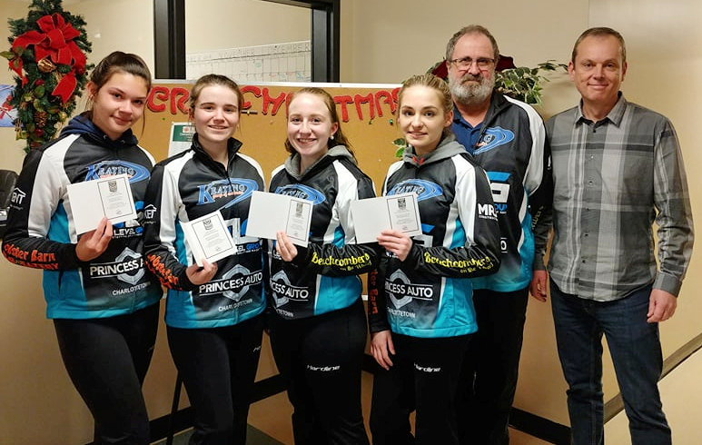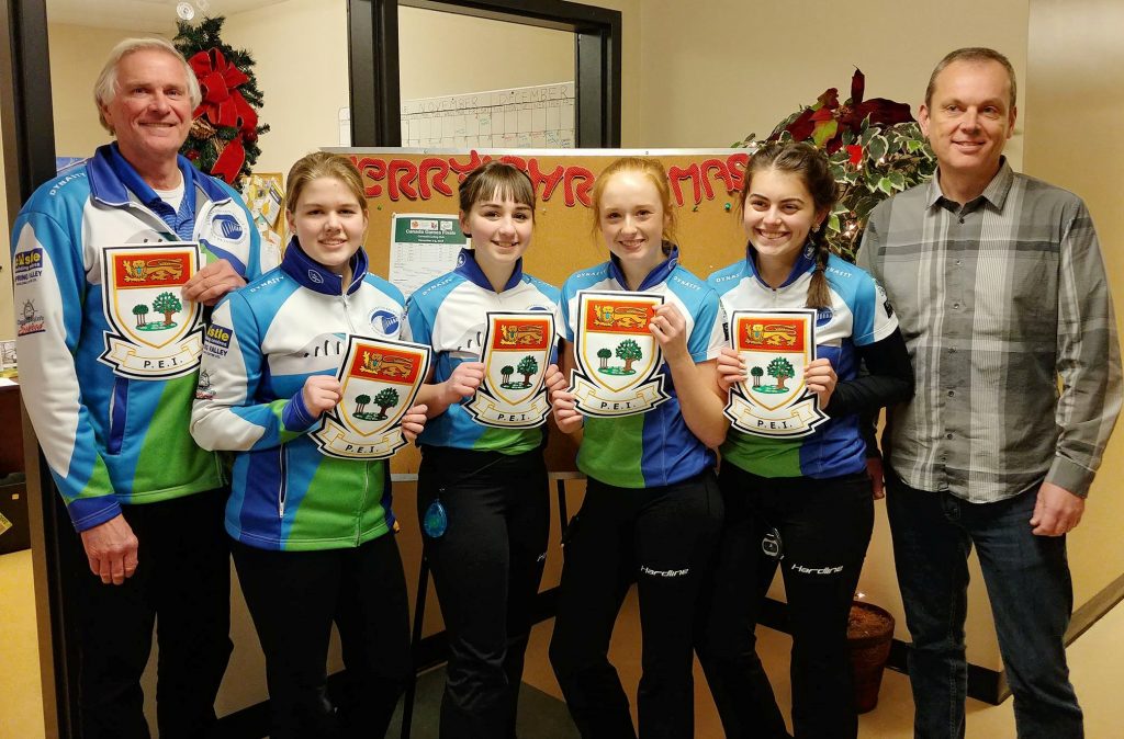 PEI Canada Games finalist team (L-R): Sierra Clyke (callw the game), Sydney Howatt (throws final stones), Meghan Sherren (second), Madelyn Cantwell (lead), A.J. Campbell (coach), Andrew Robinson (Curl PEI Past President)