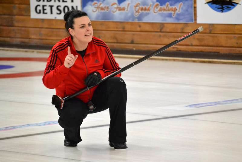 Miranda Ellis, second stone on Melissa Morrow’s Silver Fox rink gives directions to her sweepers after releasing a stone in the opening draw of the P.E.I. Scotties Women’s Curling Championship at Western Community Curling Club Wednesday. – Eric McCarthy