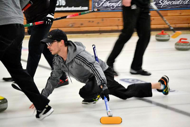 Patrick Ramsay, second stone for the Jamie Newson rink from the Silver Fox Curling Club, slides through traffic after releasing his stone during the P.E.I. Tankard Provincial Men’s Curling championship at the Western Community Curling Club. – Eric McCarthy