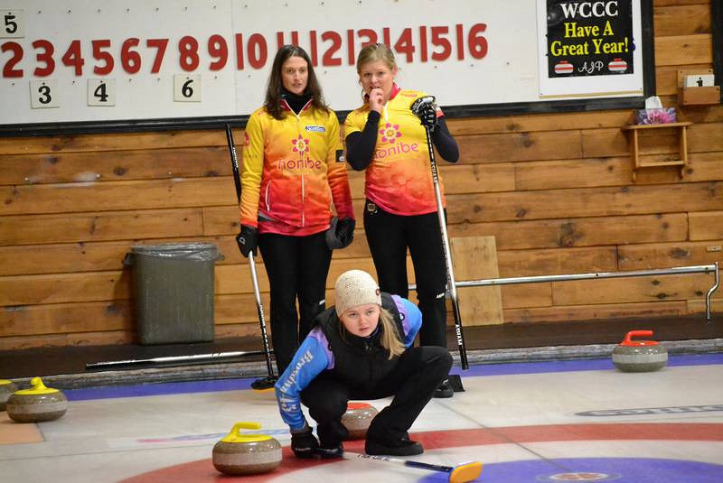 Jane DiCarlo, Sabrina Smith and Whitney Jenkins round out the runner-up rink from the modified triple knock out championship event which got underway at the Western Community Curling Club Wednesday during a snowstorm.