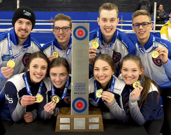 Both gold-medal teams are back from the 2018 event to attempt to defend their titles at the 2019 New Holland Canadian Juniors. And Tyler Tardi (back row, left), Sterling Middleton (back row, second from left) and Karlee Burgess (front row, third from left) have a chance to become the first three-time Canadian junior champions. (Photo, Curling Canada/Michael Burns)