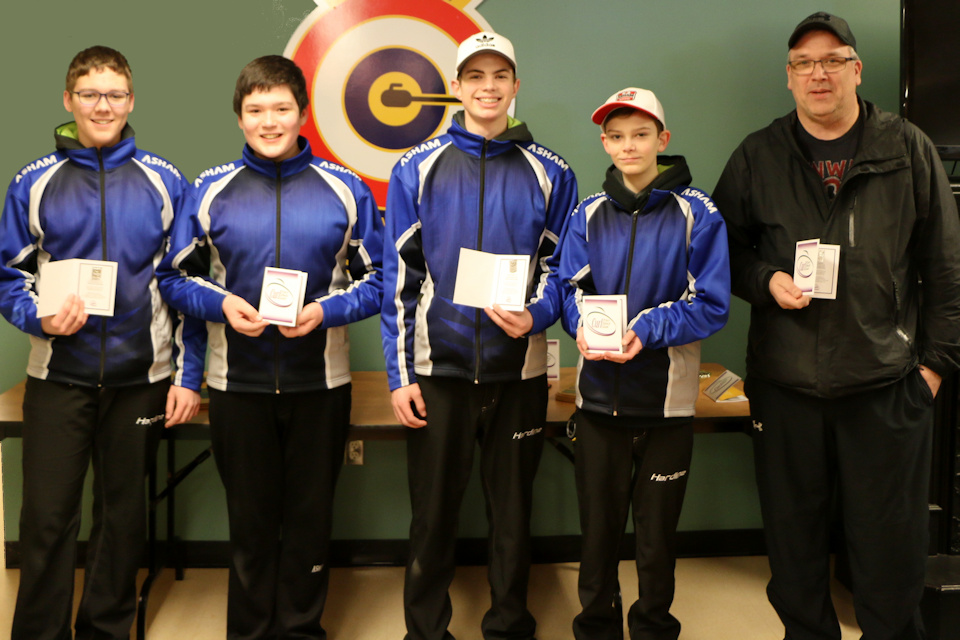 PEI U18 Boy’s Finalist rink (L-R): Chase MacMillan (skip), Jack MacFadyen (3rd), Liam Barbrick (2nd), Davis Nicholson (lead), David MacFadyen (coach), from the Charlottetown Curling Complex