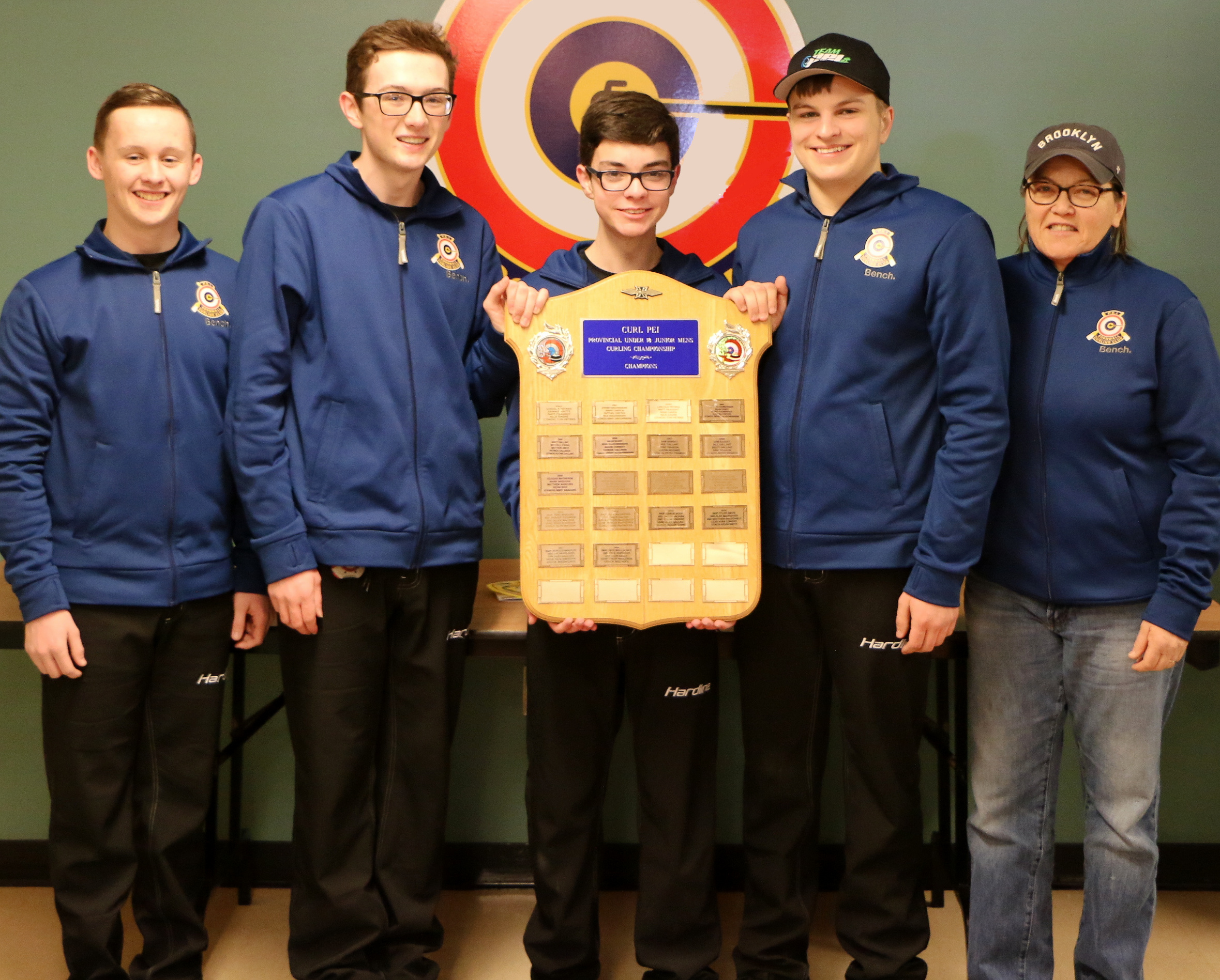 PEI U18 Boy’s Championship Team (L-R): Mitchell Schut (skip), Nick Johnston (3rd), Liam Kelly (2nd), Colin MacKenzie (lead), Lori Robinson (coach), from the Cornwall Curling Club