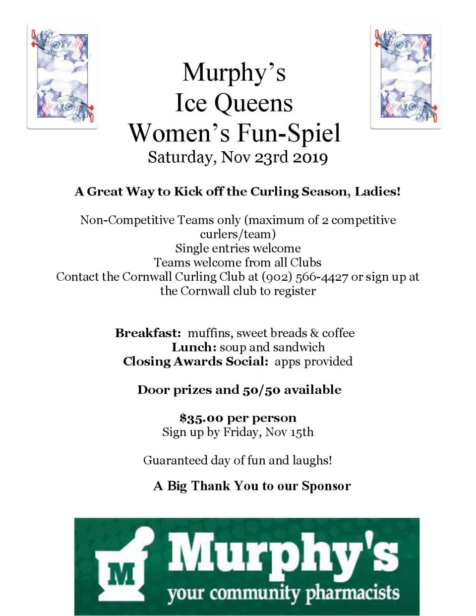 The annual Murphy’s Ice Queens Women’s Fun-Spiel takes place Saturday, Nov 23rd 2019 here at the Cornwall Curling Club, and is a great way to kick off the curling season! This event is open to female curlers from all clubs.