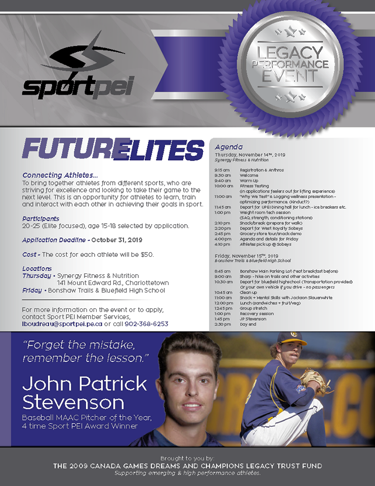 Sport PEI hosting Future Elites Legacy Performance Event Posted on October 24, 2019 by adminOctober 24, 2019 Sport PEI is hosting Future Elites November 14th and 15th for ages 15-18. Details on poster Guest Athlete is MAAC Pitcher of the year and 4 time Sport PEI award winner – John Patrick Stevenson! Deadline to apply is October 31st, 2019.