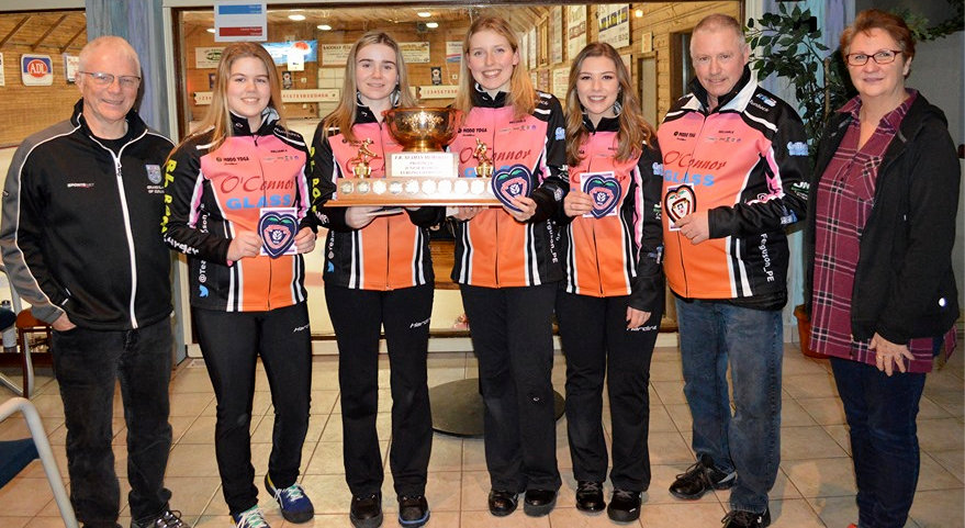 Winning Team photo (L-R): Craig Mackie (Vice President Curl PEI), Lauren Ferguson, Sydney Howatt, Kristie Rogers, Rachel O’Connor, coach Pat Quilty, Vivian Sherren (Crapaud Community Curling Club President)