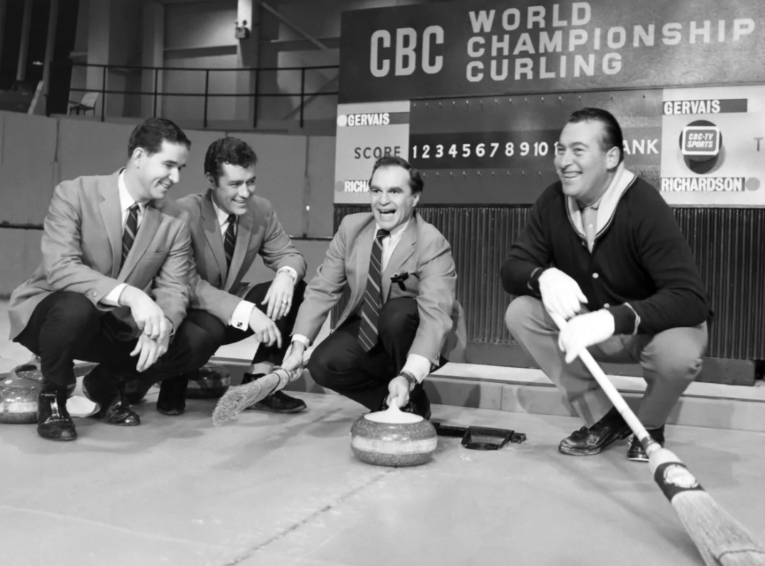 Trebek, who, like Greenan, attended the University of Ottawa, is also no stranger to the sport of curling, having been on the CBC curling broadcast team back in the 1960s, as can be seen in this 1968 promotional photo for CBC World Championship Curling: