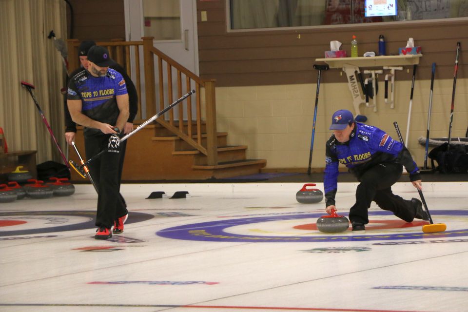 Jonathan Greenan (right) delivers a rock at the PEI Tankard last year at the Montague Curling Club