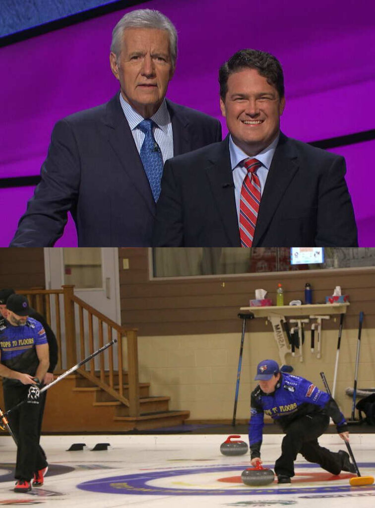 Trebek started off his first contestant interview with Greenan with the line “You’re a professional curler”. Greenan responded, “I wouldn’t say professional, I’d say semi-professional at best, and only because we’ve won a little bit of money here and there, at bonspiels”. Trebek asked about the “Canadian Brier” and Greenan responded that “we’re not quite there yet”.