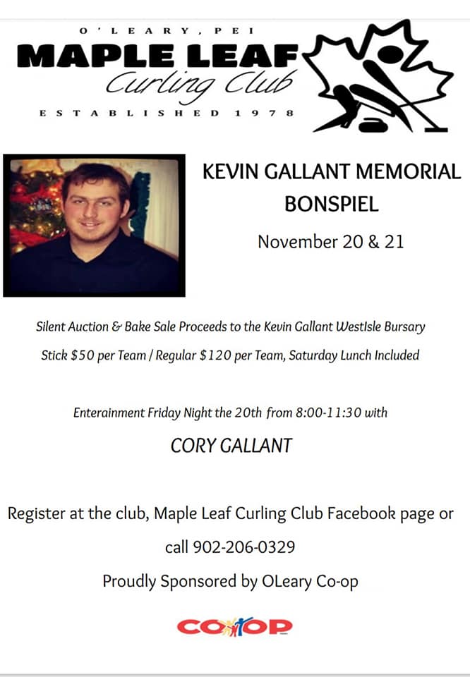 The Kevin Gallant Memorial Bonspiel, proudly sponsored by the O’Leary Co-op, takes place Nov. 20 and 21 at the Maple Leaf Curling Club in O’Leary.