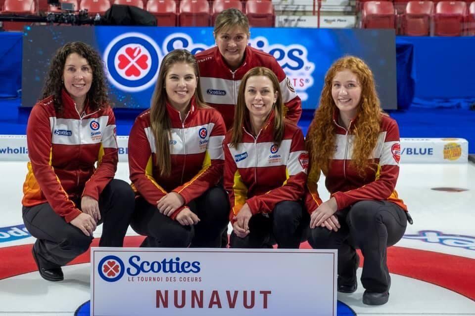 Team Nunavut at the 2020 Scotties Tournament of Hearts in Moose Jaw, Saskatchewan. The team will be travelling to Calgary to play in this year’s tournament. Due to COVID-19, the competition will look different with Curling Canada setting up a hub city at the Markin MacPhail Centre at WinSport’s Canada Olympic Park in Calgary for all their 2021 national events. In photo: L-R: Skip Lori Eddy, Third Sadie Pinksen, Second Alison Griffin and Lead Kaitlin MacDonald with the team’s Coach Donalda Mattie in the back. Submitted photo