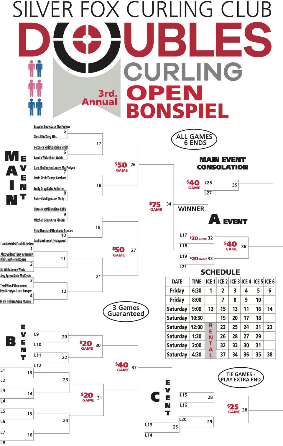 Fox Doubles Bonspiel Draw Posted on February 12, 2021 by adminFebruary 12, 2021 Here is the draw for the Doubles Bonspiel at the Silver Fox this weekend.