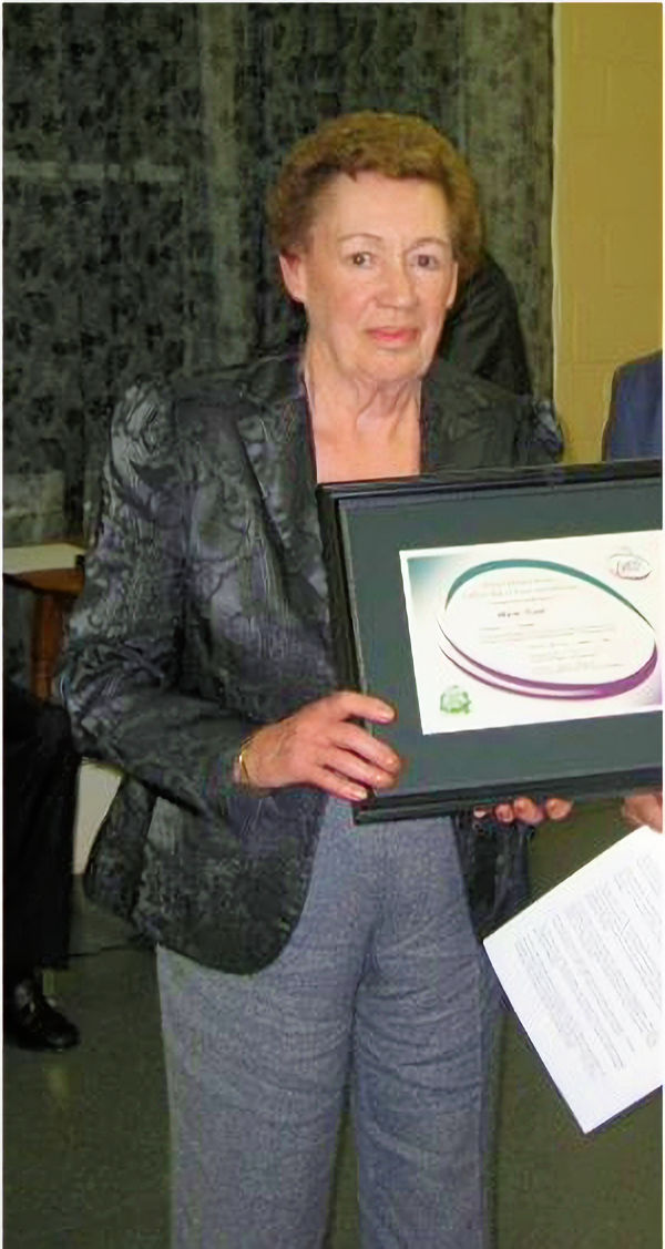 Marie Toole receiving her 2008 PEI Curling Hall of Fame induction certificate