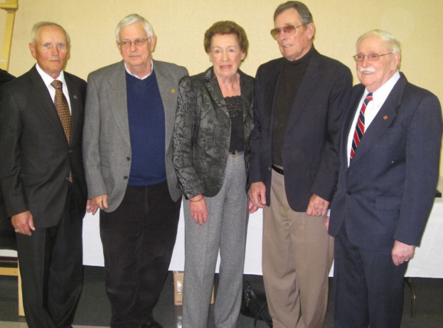 2008 Hall of Fame Ceremony Photo (L-R): Jerry Muzika, Chair PEI Curling Hall of Fame and Museum, inductee Al Ledgerwood, inductee Marie Toole, John Squarebriggs Jr., son of posthumous inductee John Drake Squarebriggs, inductee Freeman Miles.