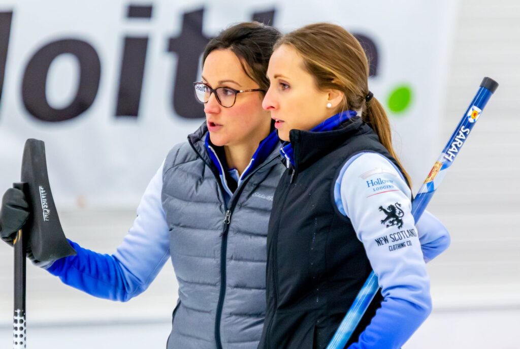 Third stone Erin Carmody, right, and skip Jill Brothers discuss strategy during the 2019 Nova Scotia women’s curling championship in Dartmouth. Team Brothers is competing this week in the Canadian Curling Pre-Trials Direct-Entry Event in Ottawa, Ont. Carmody grew up in Summerside and is a product of the junior curling program at the Silver Fox Entertainment Complex.