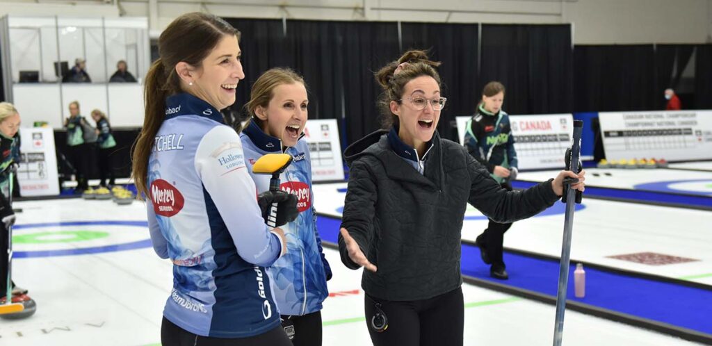 From left, Jenn Mitchell, Erin Carmody and Jill Brothers celebrate after qualifying for the Home Hardware Curling Pre-Trials. (Photo, Curling Canada/Claudette Bockstael)