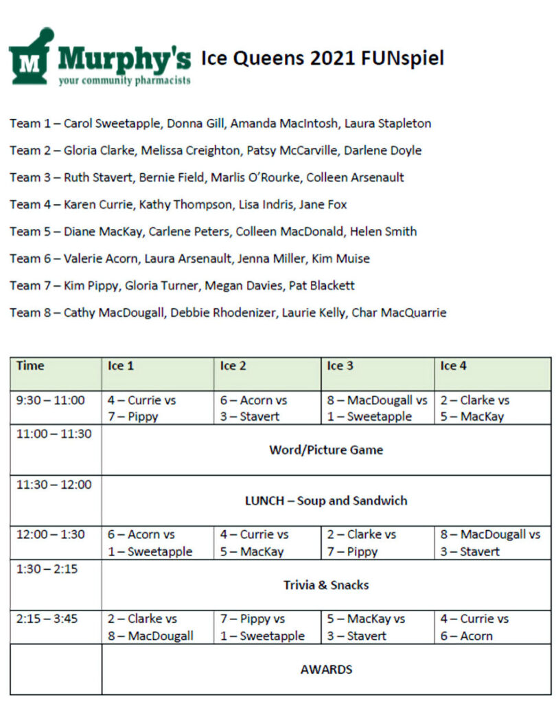 Here are the teams and the schedule for the 2021 Ice Queens Women’s FUNspiel for this Saturday, November 20th at the Cornwall Curling Club.