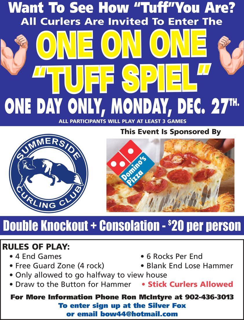 The Summerside Curling Club’s annual 1 vs 1 “Tuff Spiel”, scheduled for December 27th, has now been postponed due to public health measures announced this afternoon.